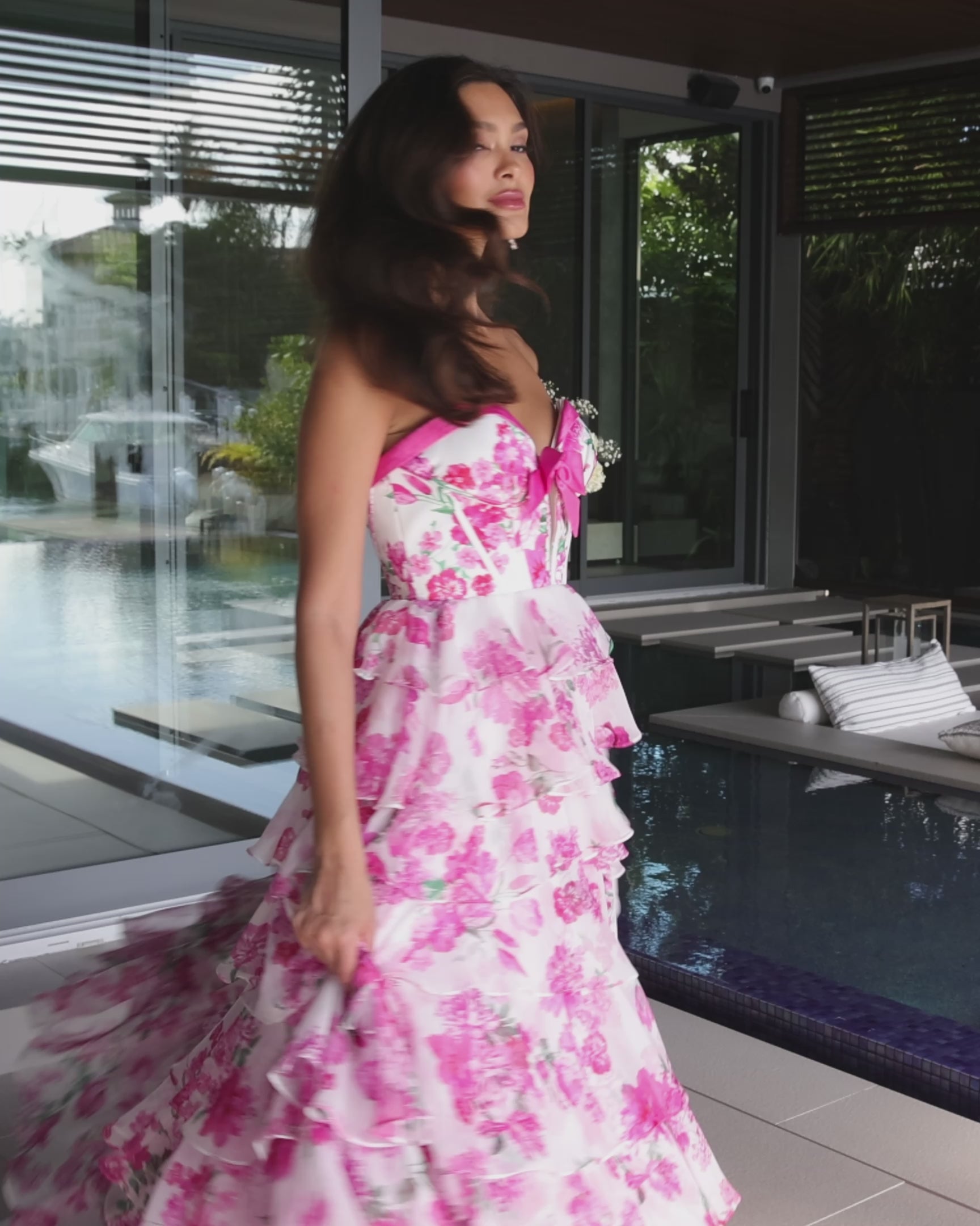 Make a show-stopping entrance in this romantic Ava Presley 42207 gown. Featuring a structured floral corset bodice with a sweetheart neckline and playful front bow, the dress flows into a cascade of ruffled layers that exude elegance and movement. A high front slit adds a daring touch to the feminine charm, making it perfect for prom, pageants, or formal occasions.