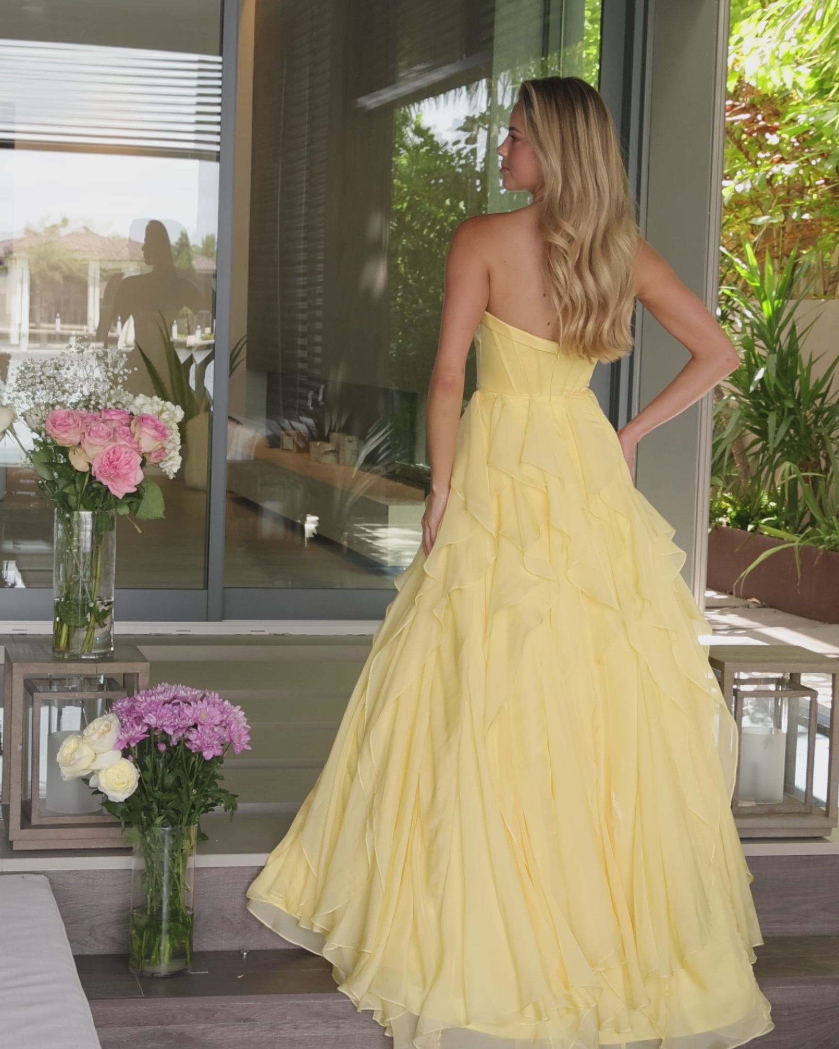 Step into elegance with the Ava Presley 42209, a dreamy gown designed to captivate at every formal occasion. With its strapless structured bodice and layers of cascading ruffles, this dress brings effortless grace and romantic drama to life. The flowy A-line silhouette allows for comfortable movement while maintaining a red-carpet-worthy presence.
