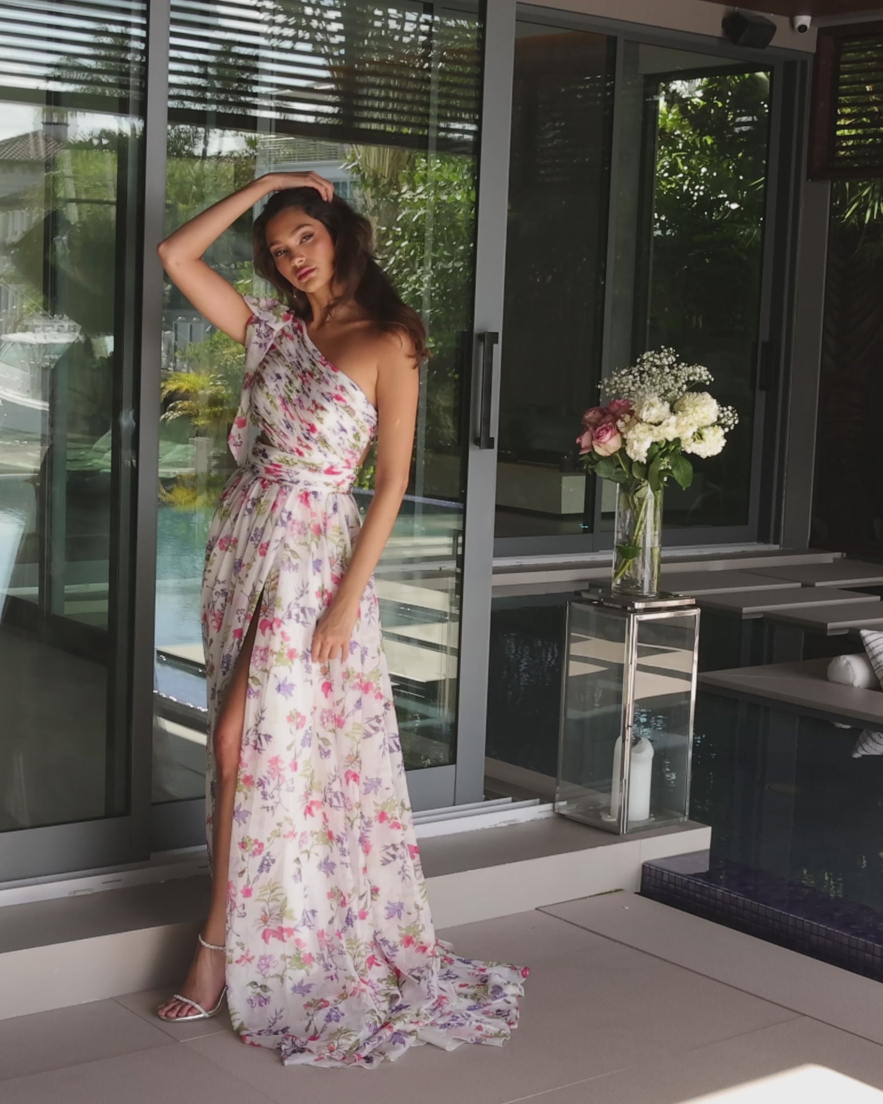 The Ava Presley 42237 gown is a stunning one-shoulder A-line dress that captures elegance and whimsy in equal measure. With its romantic floral chiffon, flattering waist cut-out, and flowing silhouette, this piece is perfect for garden events, prom nights, or spring soirées. The high slit adds a modern touch to its timeless appeal.