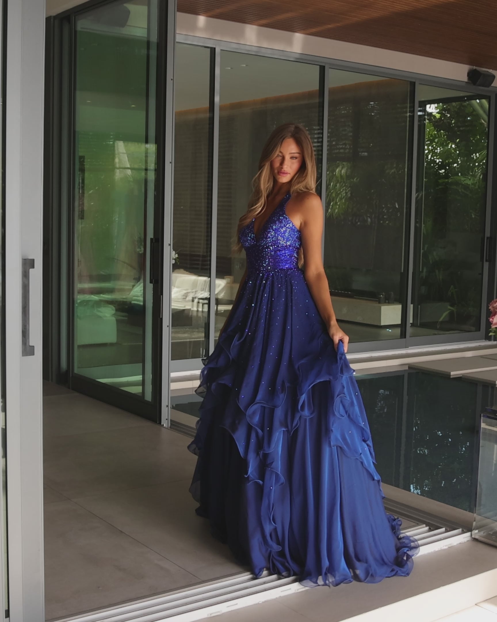 Make a royal entrance in this breathtaking ball gown featuring a sparkling beaded bodice and cascading ruffled skirt. The halter neckline and layered design bring movement and elegance, perfect for pageants, galas, or prom nights.