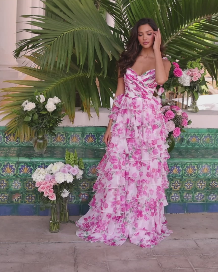 Make a statement in the breathtaking Ava Presley 42332 floral high-low gown. This enchanting dress features romantic pink rose prints, cascading ruffle tiers, and a sweetheart neckline that exudes femininity. Delicate floral shoulder straps and an open back complete the ethereal look, making Ava Presley is the perfect choice for proms, pageants, and garden-inspired events.