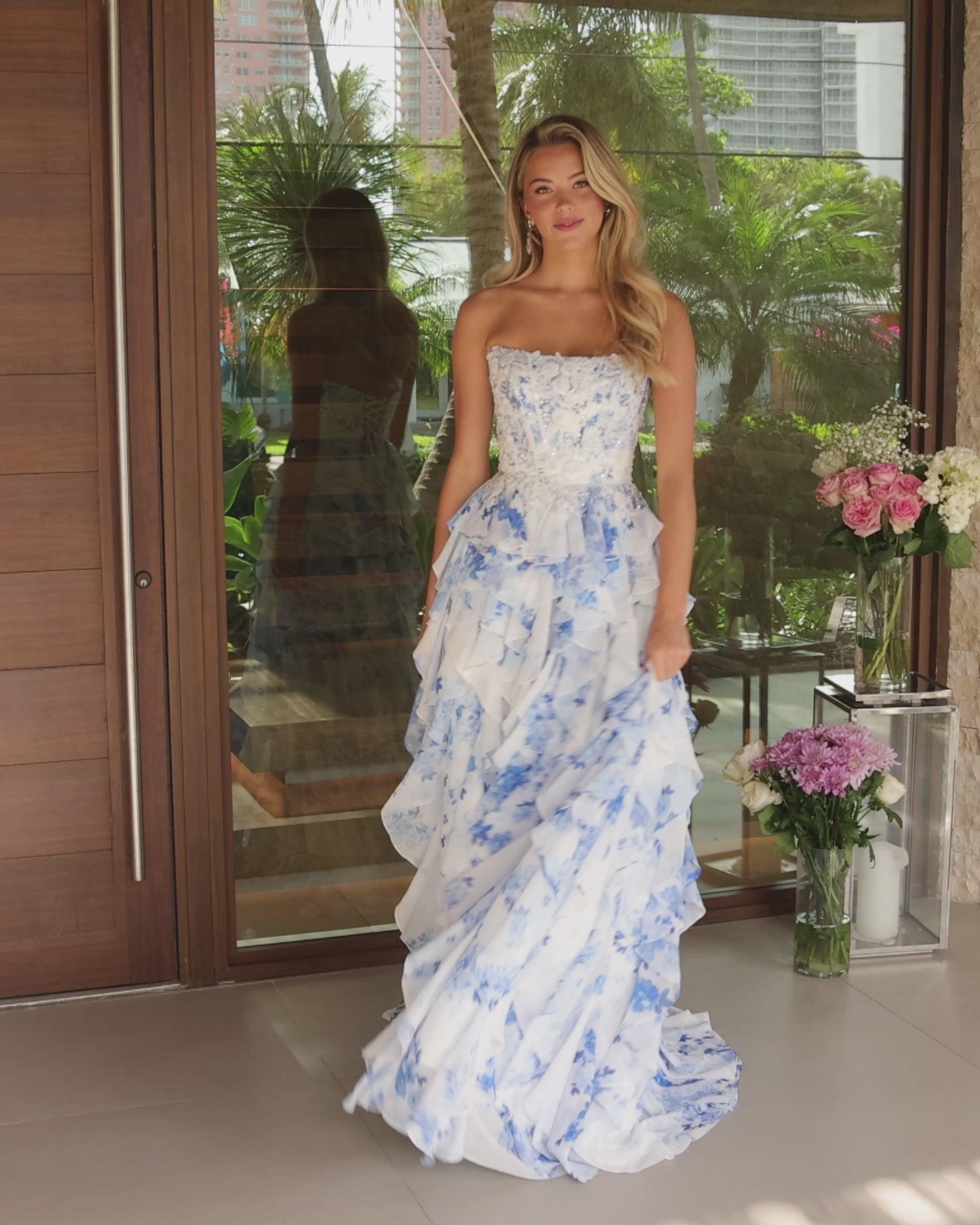Romantic and ethereal, this strapless floral ball gown showcases delicate blue blooms on layered ruffles, paired with a lace-up corset back for a graceful silhouette. Ideal for prom, quinceañeras, or any elegant occasion.