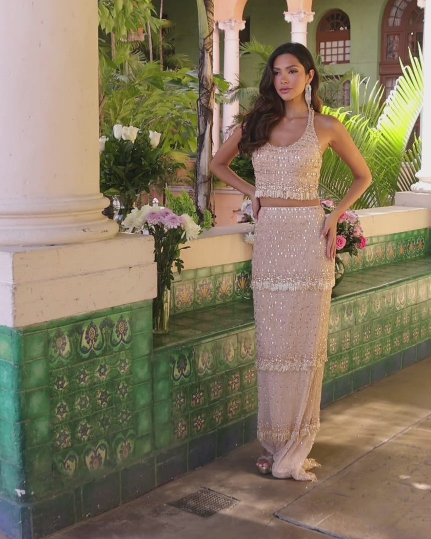 Elevate your evening style with this elegant two-piece gown, Ava Presley 47237, designed to turn heads with every step. The shimmering beadwork, halter neckline, and body-contouring silhouette create a perfect blend of glamour and sophistication ideal for pageants, prom nights, or red carpet moments.