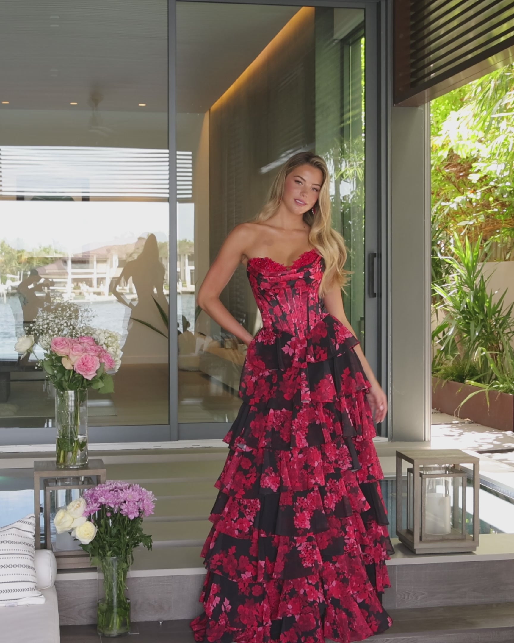 Make a romantic statement in this strapless floral print gown featuring a structured corset bodice and tiered ruffle skirt. The bold pattern and feminine silhouette make it an unforgettable choice for prom or any grand event.