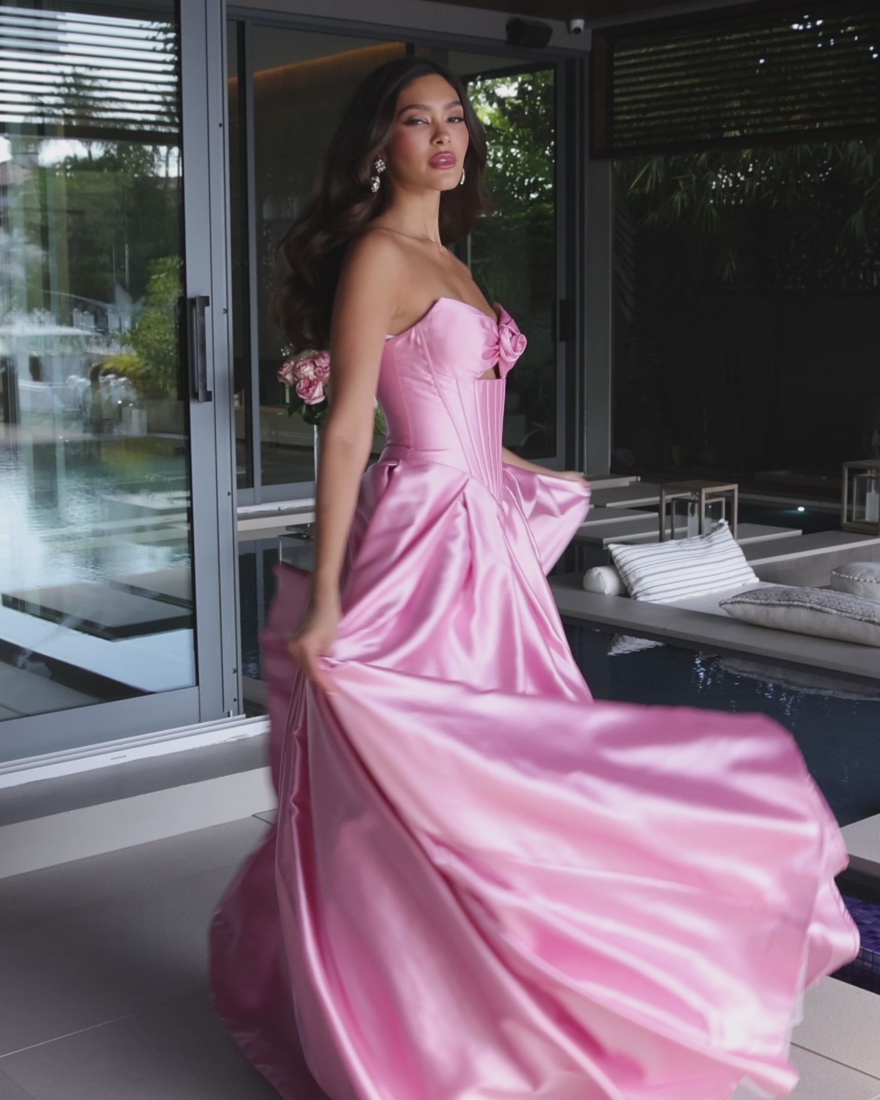 Add a regal touch to your wardrobe with the Ava Presley 47223 ball gown, a dreamy pink satin masterpiece. This strapless beauty features a structured bodice with a sheer corset panel and floral detail, enhancing its modern princess aesthetic. Perfect for prom, pageants, or formal galas, the full pleated skirt creates a statement silhouette that commands attention.